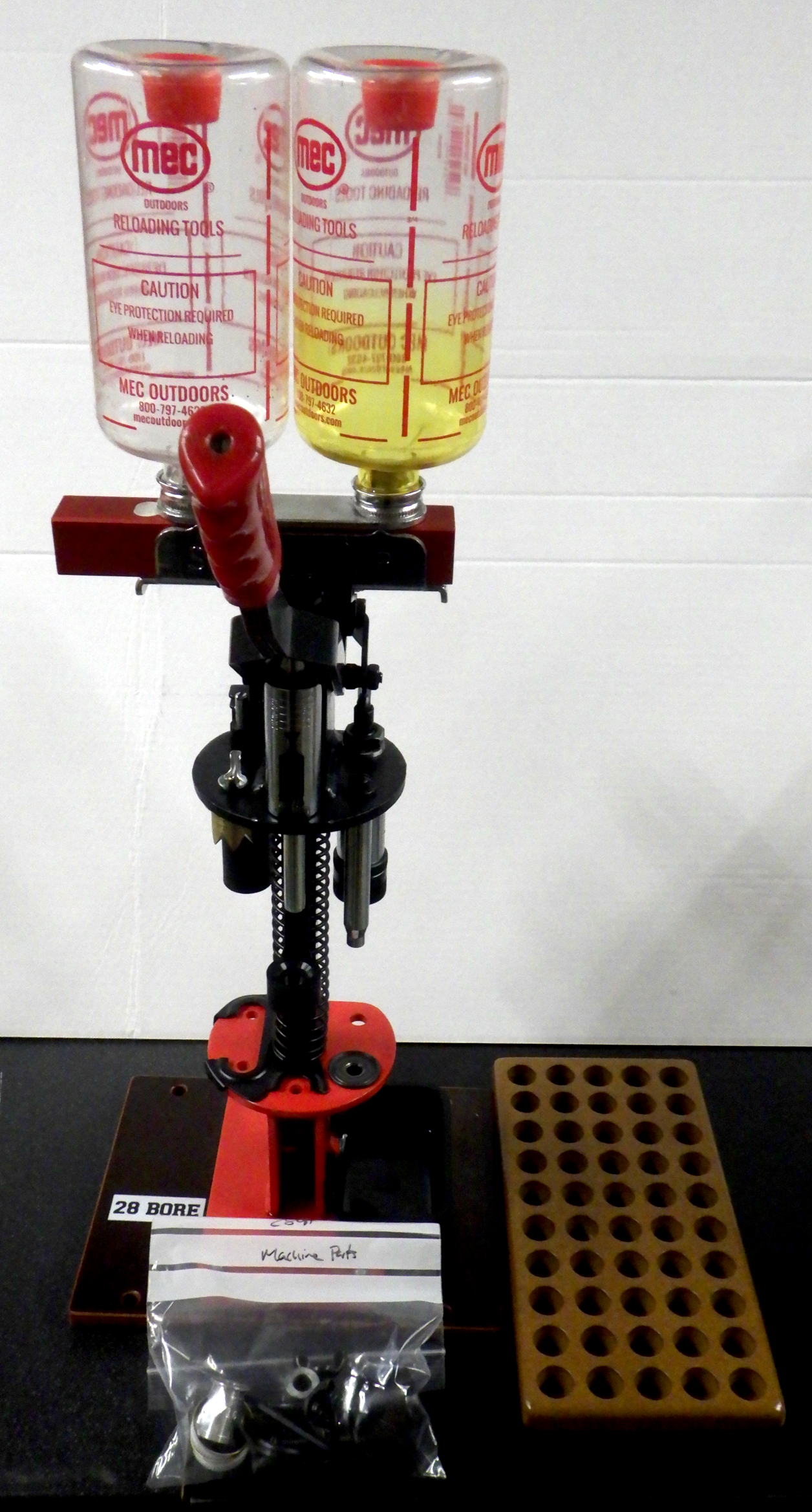 MEC 28GA 600Jr Single Stage Loader - This loader is 2nd hand but very clean and looks nearly new. Comes complete with 3 x powder bushings, 21g Lead Shot Charge bar, Brass Crown Crimer and 28GA Wooden Case Tray.